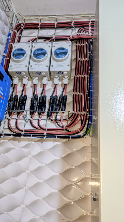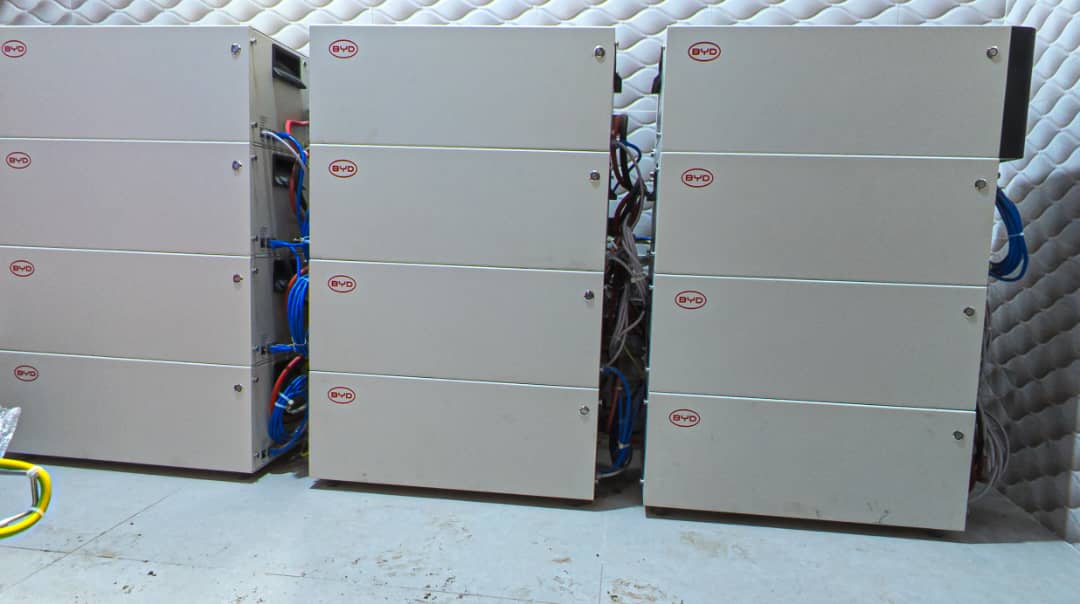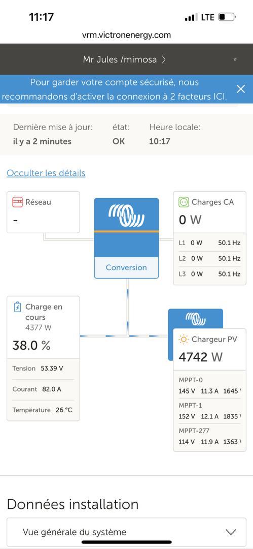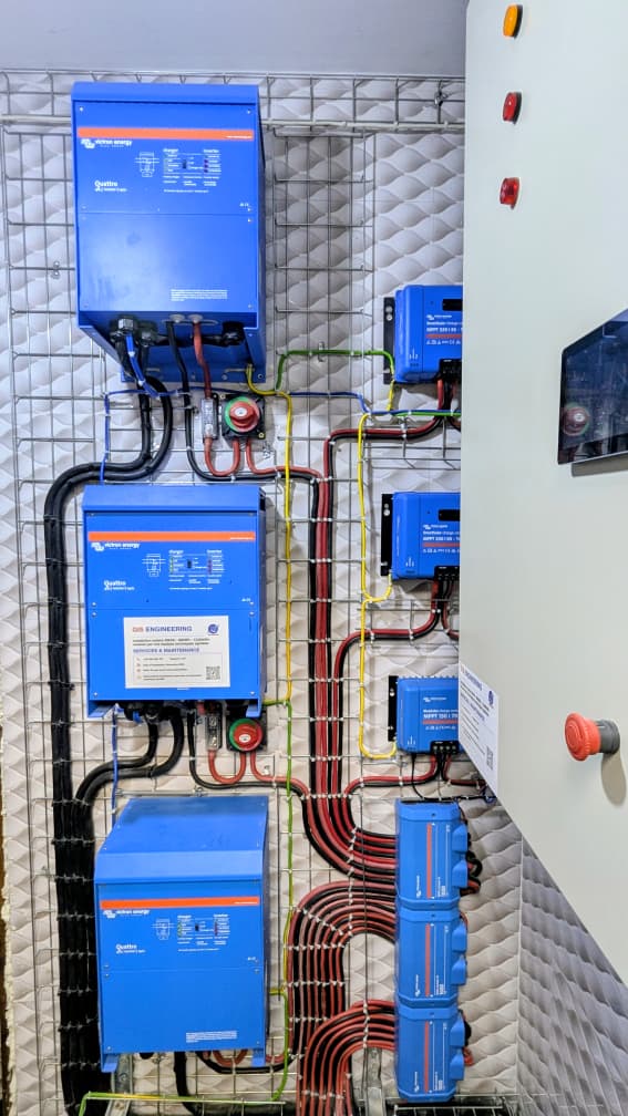 L’énergie produite est stockée dans 12 batteries BYD LV 5.0, représentant une capacité de 60 kWh, suffisante pour absorber les coupures réseau et maintenir les usages essentiels. La gestion de l’ensemble est confiée à 3 onduleurs Victron Quattro 48/10000, couplés à un boîtier de gestion automatique, capable de prioriser le solaire, puis de basculer intelligemment vers le réseau ou le générateur, sans interruption perceptible.