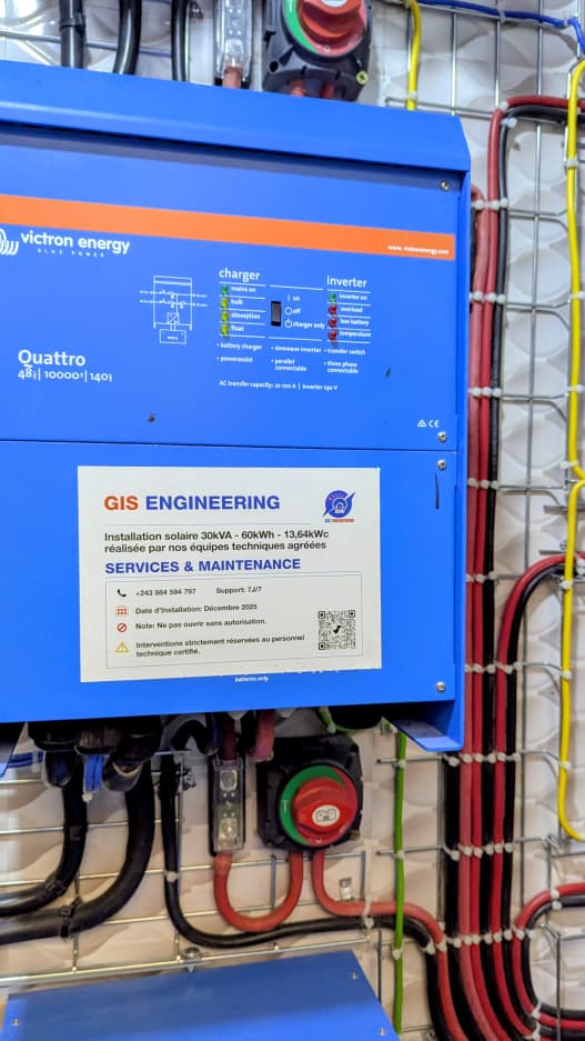 Le système installé par GIS Engineering repose sur une architecture triphasée de 30 kVA, dimensionnée pour répondre aux besoins réels d’un bâtiment collectif. La production solaire, assurée par 22 panneaux photovoltaïques de 620 W, offre une puissance totale de 13,64 kWc, exploitant pleinement le fort ensoleillement de Kinshasa.